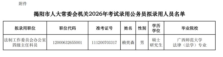 附件:揭阳市人大常委会机关2026年考试录用公务员拟录用人员名单